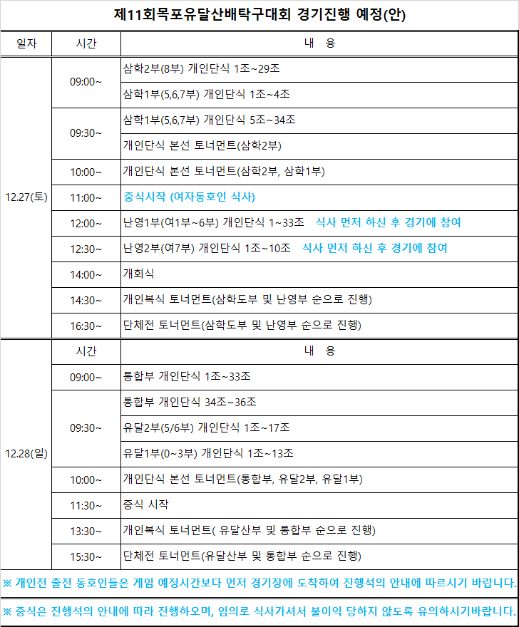 제11회목포유달산배전국오픈탁구대회 경기진행예정(안)